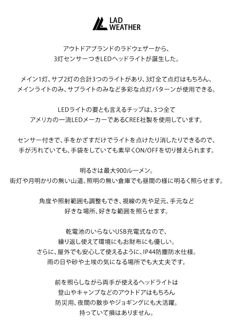 ヘッドライト 充電式 超軽量42g センサー搭載のLEDヘッドライト IP44 防塵・防水 LED ライト USB充電 小型 強力 高輝度 防災 災害 グッズ キャンプ アウトドア 登山 アウトドア用品 キャンプ用品 釣り 作業用 散歩 林業 農業 LAD WEATHER ラドウェザー