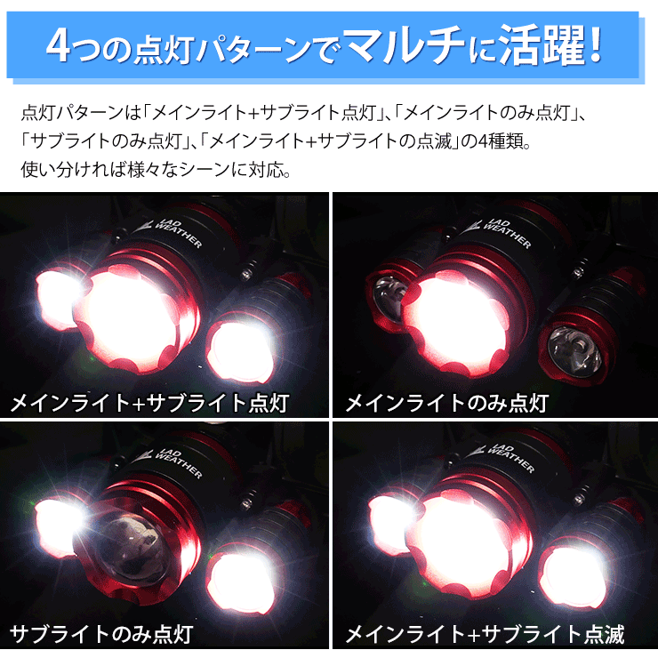 メインライトのみやサブライトのみなど多彩な点灯パターンで使用できます。