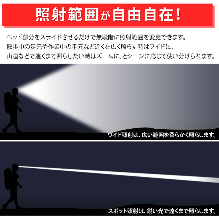 山道などで遠くまで照らしたい時はズームに、とシーンに応じて使い分けられます。