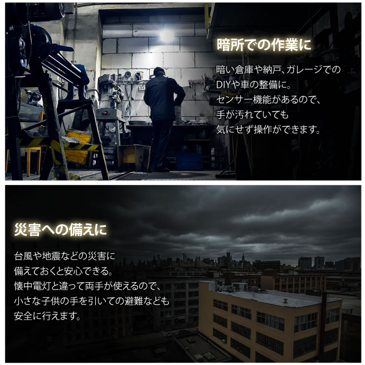 街灯や月明かりの無い山道、照明の無い倉庫でも昼間の様に明るく照らせます。